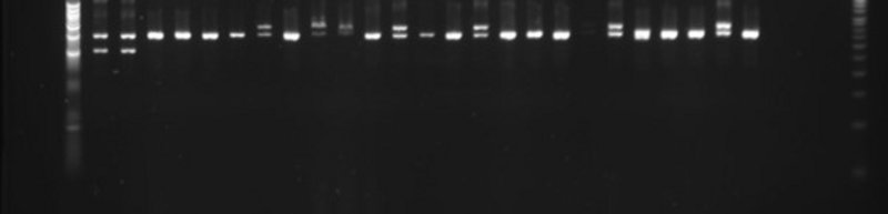 Agarosegel af PCR kørt på blodprøver, der bruges til at bestemme MHC-haplotyper af forskellige kyllinger. Forskellige MHC-haplotyper kan have betydning for immuno kompetencerne i kyllingerne. Fordelingen af Haplotyper var ikke ens mellem de forskellige behandlinger, hvilket kan have haft betydning for resultaterne.